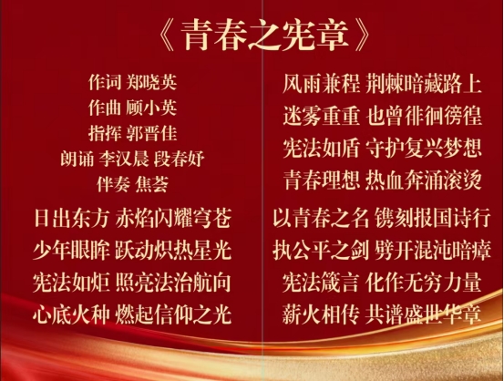 青春,如旭日喷薄,闪耀炽热的光芒;宪法,如基石永固,奠定复兴的梦想。我们迎着东方的曙光,肩负时代的重量,在法治的航道上,以青春之名,书写报国的誓言。