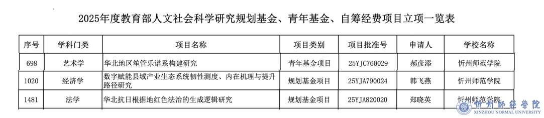 近日,教育部社会科学司发布了《关于2025年度教育部人文社会科学研究一般项目立项的通知》,我校经济管理系副教授韩飞燕、法律系副教授郑晓英喜获2025年度教育部人文社会科学研究规划基金项目,音乐系郝彦添博士喜获2025年度教育部人文社会科学研究青年基金项目。
